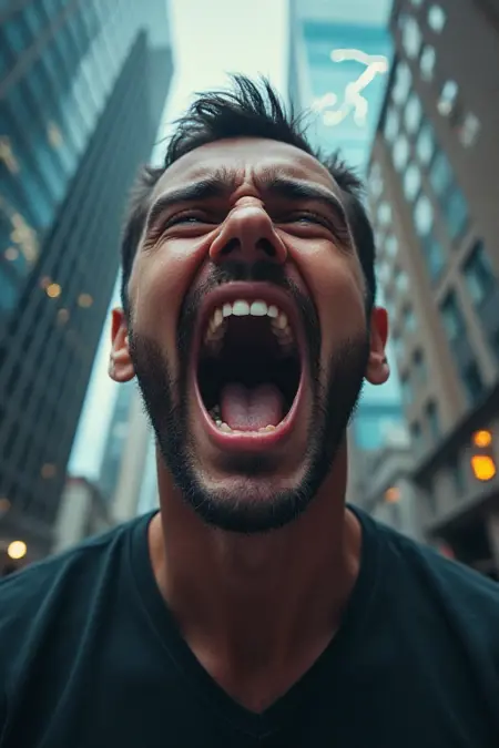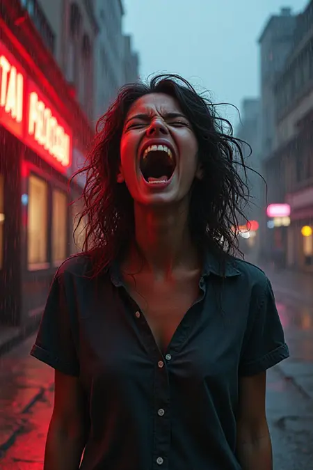 "천둥 폭풍 속 도시 거리에서 비명을 지르는 중년의 남성. 벌어진 입에서 이빨이 드러나고, 눈은 꼭 감기며, 바람에 흩날리는 머리카락, 찢어진 셔츠와 절망 속에 들어 올린 팔. 배경에는 번개, 무너지는 건물, 붉은 네온 빛을 반사하는 웅덩이. 두꺼운 붓터치와 생생한 색조(빨강, 검정, 전기 노랑)로 표현된 표현주의 스타일."