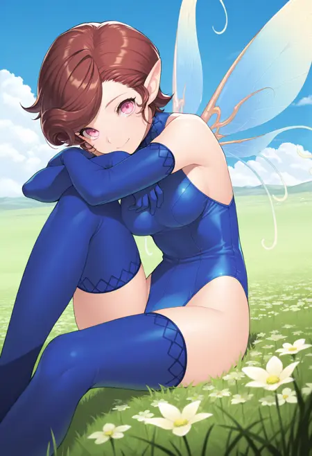 기본 외모: 갈색 머리, 단발, 쓸어올린 앞머리, 분홍색 눈, 뾰족한 귀, 파란 레오타드, 소매 없는 레오타드, 터틀넥, 팔꿈치 장갑, 파란 장갑, 파란 허벅지 스타킹, 요정 날개