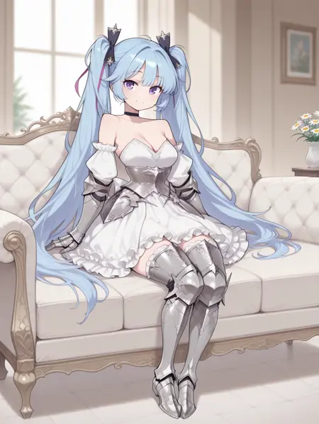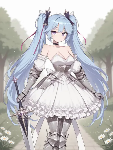 daisy, 1girl, solo, long hair, thighhighs, dress, ribbon, cleavage, bare shoulders, twintails, very long hair, blue hair, purple eyes, hair ribbon, boots, frills, detached sleeves, choker, white dress, armor, strapless, frilled dress, gauntlets, strapless dress, armored boots, greaves,