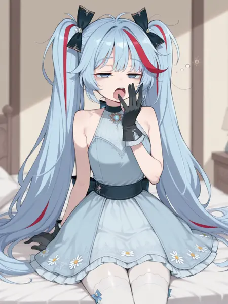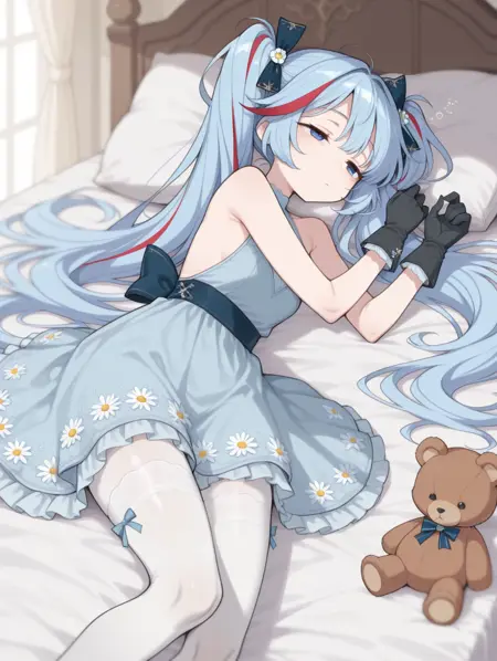 daisy, 1girl, solo, long hair, blue eyes, thighhighs, gloves, dress, bow, bare shoulders, twintails, very long hair, blue hair, pantyhose, red hair, sleeveless, black gloves, streaked hair, sleeveless dress, blue dress,