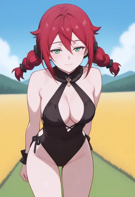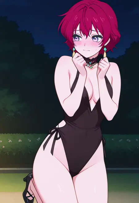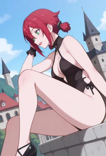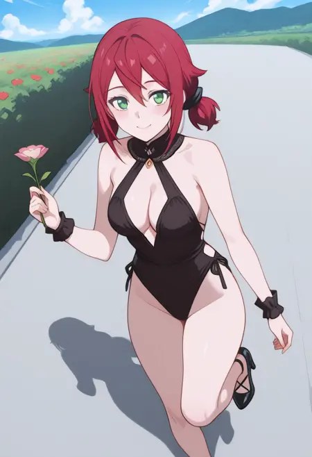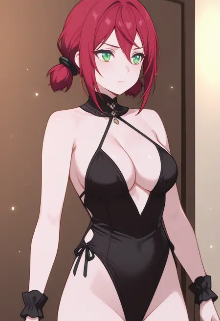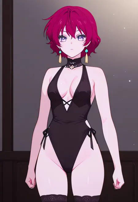 Cha22v1,black one-piece,deep cleavage,wrist cuffs,bare shoulders,cutouts,high-cut,stockings,halterneck,thigh-highs,black heels,choker,bare legs,open back,highleg,anime screencap