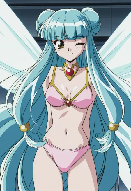 use tags like " fairy, magical knight rayearth, primera, 1girl, blue hair, long hair, wings, retro artstyle, 1990's (style), hair bun, very long hair, brown eyes, double bun, bangs, blunt bangs, jewelry, dress, pink dress,