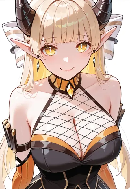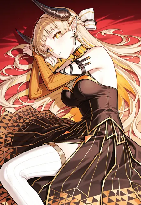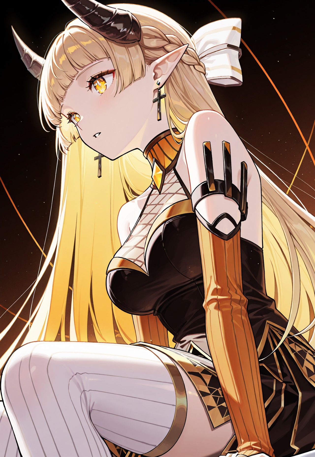 长发,金发,刘海,齐刘海,脑后辫子,丝带辫子,白色丝带,脑后丝带,角,黑色角,尖耳朵,耳环,黄眼睛,领子,分离式领子,裸露肩膀,渔网领口,大乳房,分离式袖子,无袖,橙色袖子,黑色连衣裙,开衩裙,裙下 straps,白色过膝袜,厚底高跟鞋,高跟鞋,黑色高跟鞋,