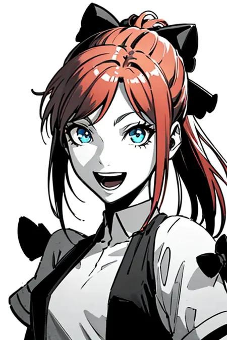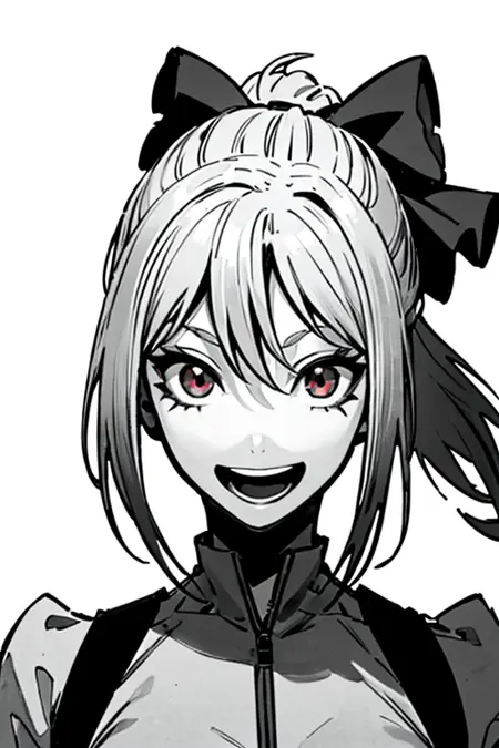 hair bow, ponytail, bow, hair ribbon, ribbon, smile, holding, ponytail, sword, open mouth, portrait