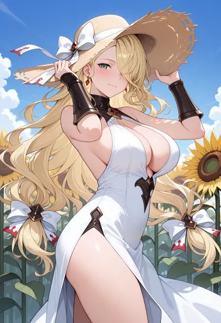 gbfprda, 金髪, 長髪, 波状の髪, アホ毛, 低く結んだ長髪, 緑色の目, ヘアボウ, 片目を覆う髪, ピアス, 大きな胸