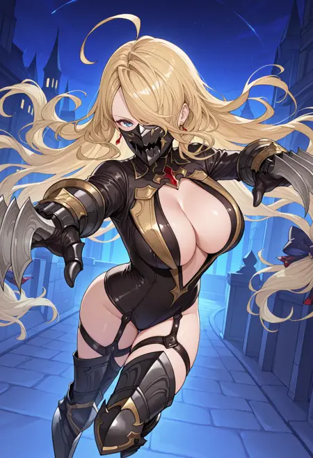 gprddef, ブラックのボディスーツ, ブラックのレオタード, 中央開口部, 胸元の開き, ロック付き首輪, 短い袖, 腋の切り取り, 股部分の開口部, 太もも切り取り, 肘までの手袋, クロー \(武器\), マスク