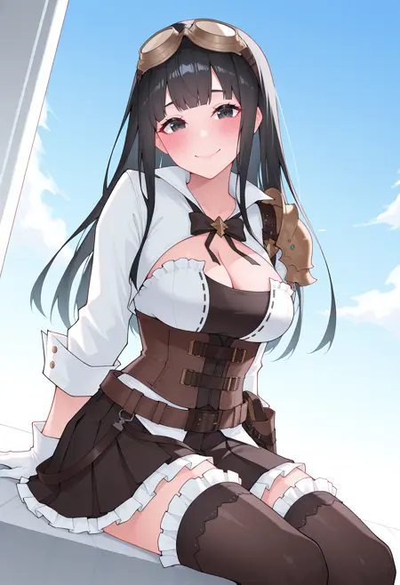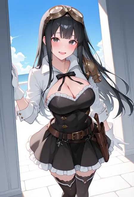- gbjesr2, cropped jacket, white shrug, corset, cleavage, untucked shirt, single pauldron, cleavage, long sleeves, frills, white gloves, black skirt, pleated skirt, frilled skirt, black thighhighs, frilled thighhighs, belt, holster, shoulder armor, boots,