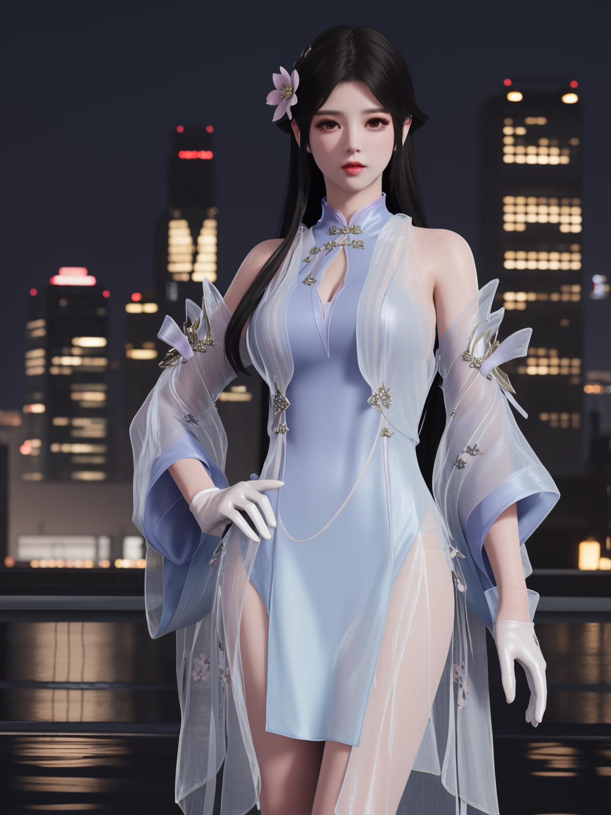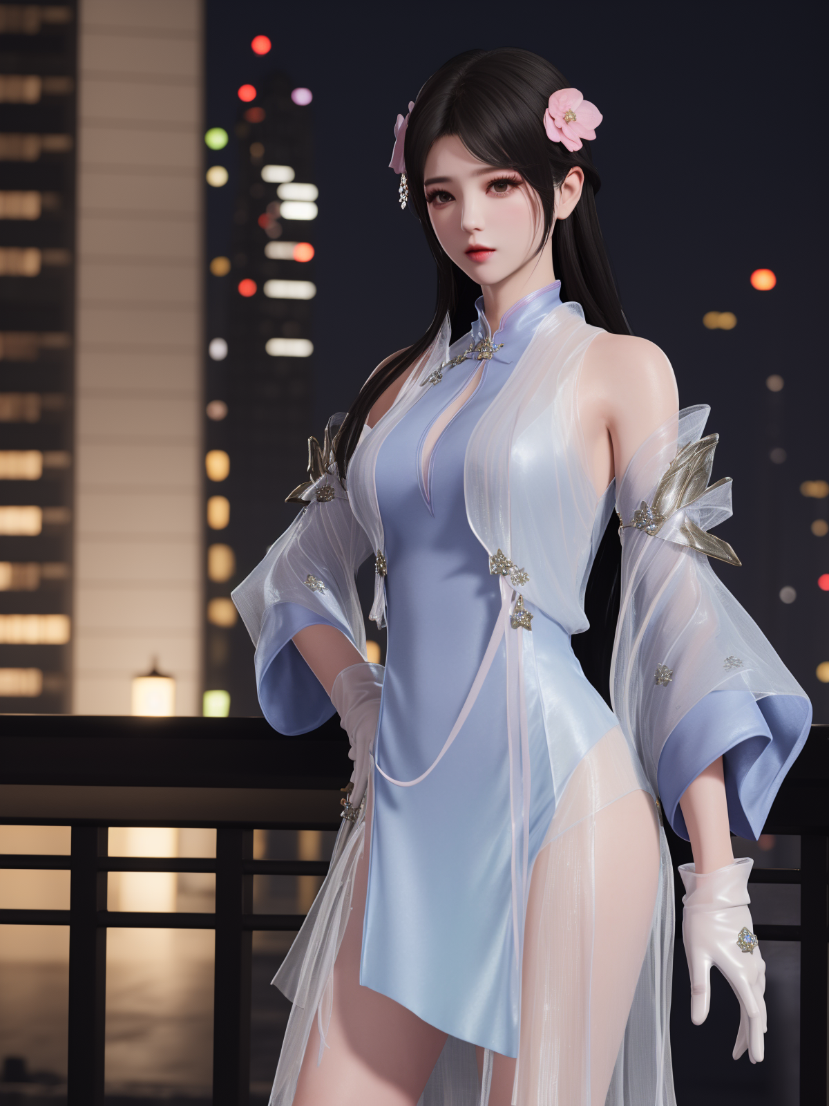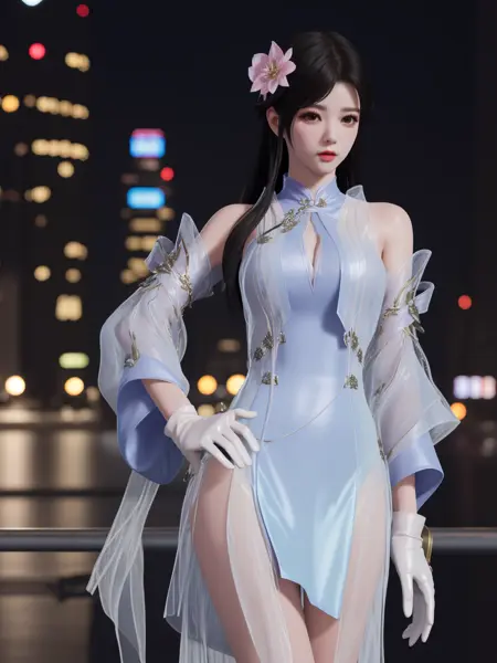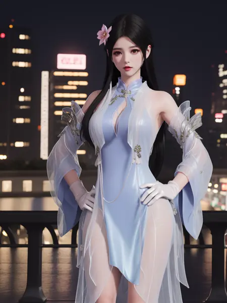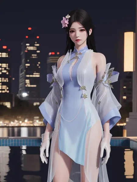 - YJWJyingzipingYGMY, 1girl, dress, solo, long hair,white gloves, hair flower, detached sleeves, bare shoulders, black hair, see-through, long sleeves, looking at viewer, mature female, cityscape, night, pool,hand on hip,