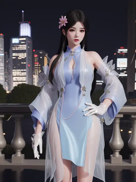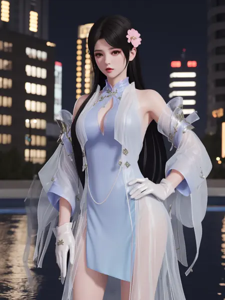 - YJWJyingzipingYGMY, 1girl, dress, solo, long hair, white gloves, hair flower, detached sleeves, bare shoulders, black hair, see-through, long sleeves, looking at viewer, mature female, cityscape, night, pool, hand on hip,