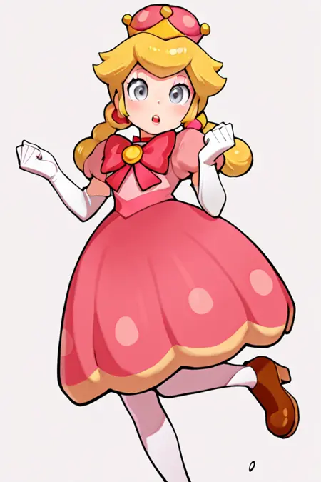 Prompts: Peachette, Blonde Hair, Gray Eyes, Super Crown, Pink Dress, White Gloves, Red Ribbon, Brown Shoes