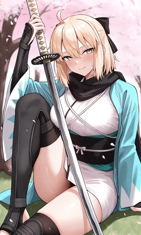 | 训练词汇 | ok1t4stg3, yellow eyes, blonde hair, short hair, half updo, hair between eyes, ahoge, hair bow, black bow, black scarf, shinsengumi, haori, straps, white kimono, sleeveless kimono, short kimono, arm guards, obi, sash, black thighhighs, stirrup legwear, black footwear, feet, toes,已复制! |