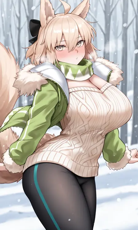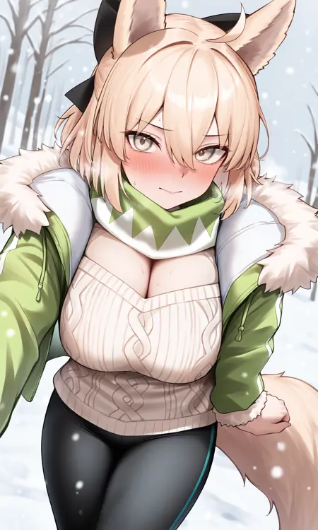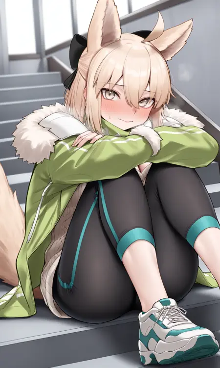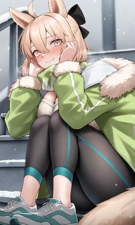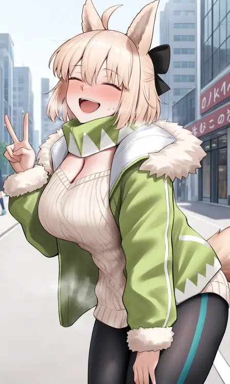 | 训练词汇 | ok1t4prt, yellow eyes, blonde hair, short hair, messy hair, ahoge, hair bow, black bow, animal ears, dog tail, scarf, fur-trimmed jacket, green jacket, long sleeves, open jacket, beige sweater, cleavage, fur trim, black leggings, yoga pants, sneakers,已复制! |
