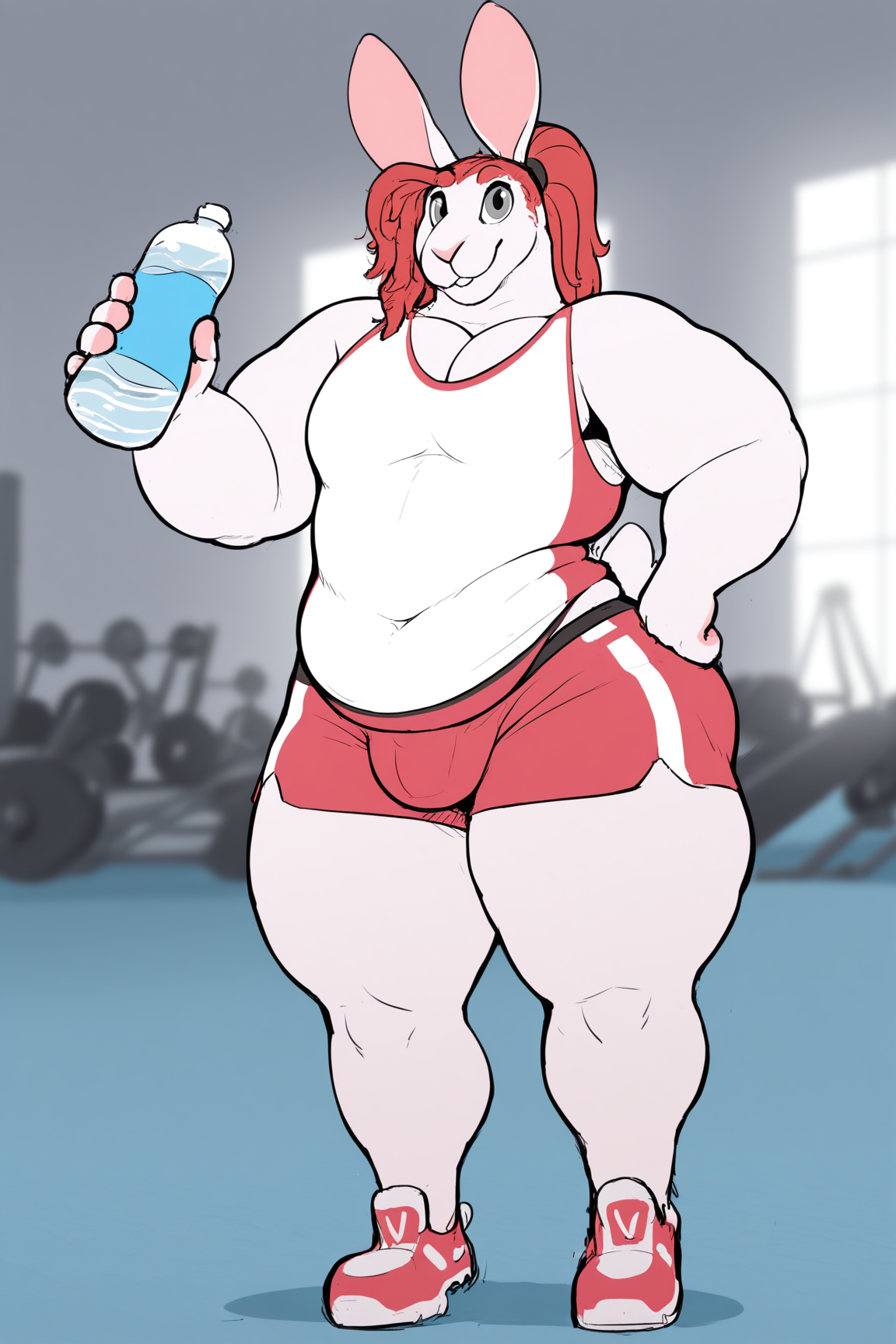 by ritts, alan white (ritts), furry, furry male, anthro, lagomorph, leporid, rabbit, red hair, long hair, grey eyes, animal nose, animal ears, snout, pink nose, white fur, body fur, overweight, overweight male, slightly chubby, thick thighs, tail, red chest tuft, 1boy, solo, male focus, hand on hip, bulge, rabbit ears, shoes, thick thighs, white shirt, thighs, sleeveless, holding, standing, light red shorts, smile, bottle, water bottle, ponytail, pectorals, sleeveless shirt, looking at viewer, gym, blurry background, front view