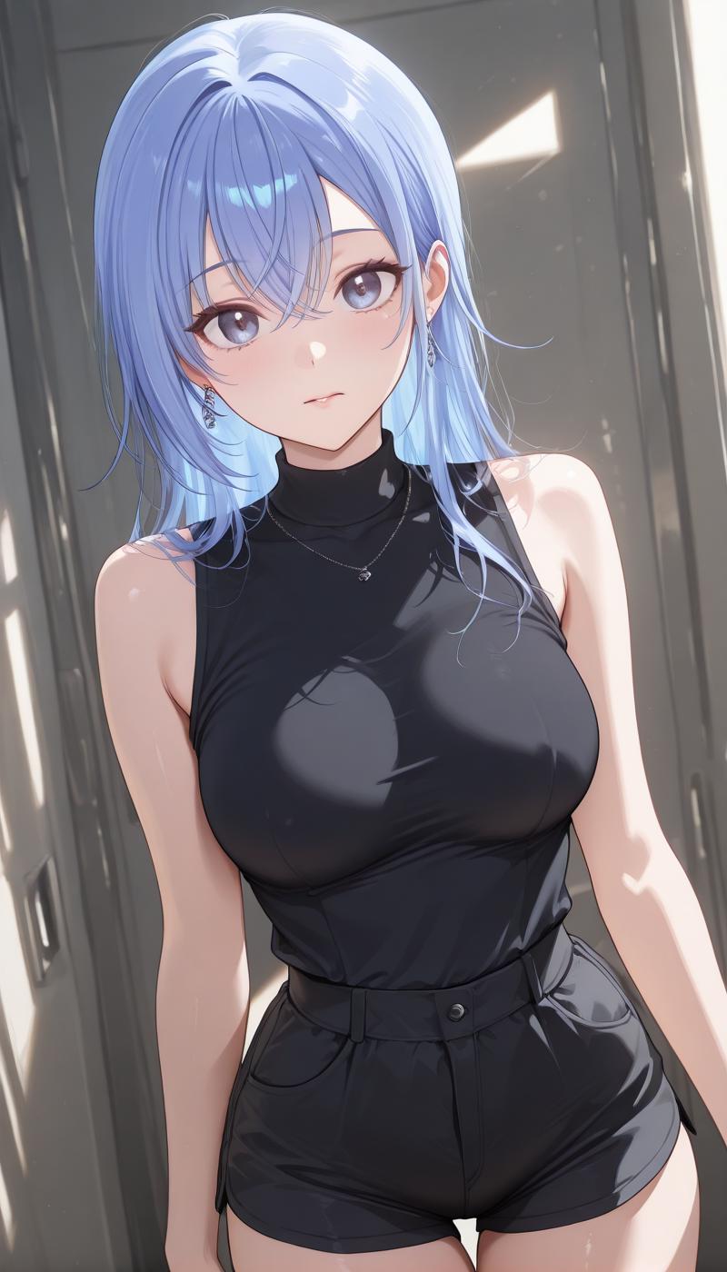 셔츠, 보석, 어깨 노출, collarbone, 허벅지, 귀걸이, 반바지, 소매 없음, 중간 길이 머리, 목걸이, 검은 셔츠, 소매 없는 셔츠, 짧은 반바지, 터틀넥, 검은 반바지, 허벅지 간격, 눈에 기호, 팔밑 주름, 소매 없는 터틀넥, 눈에 별, 팔 노출,