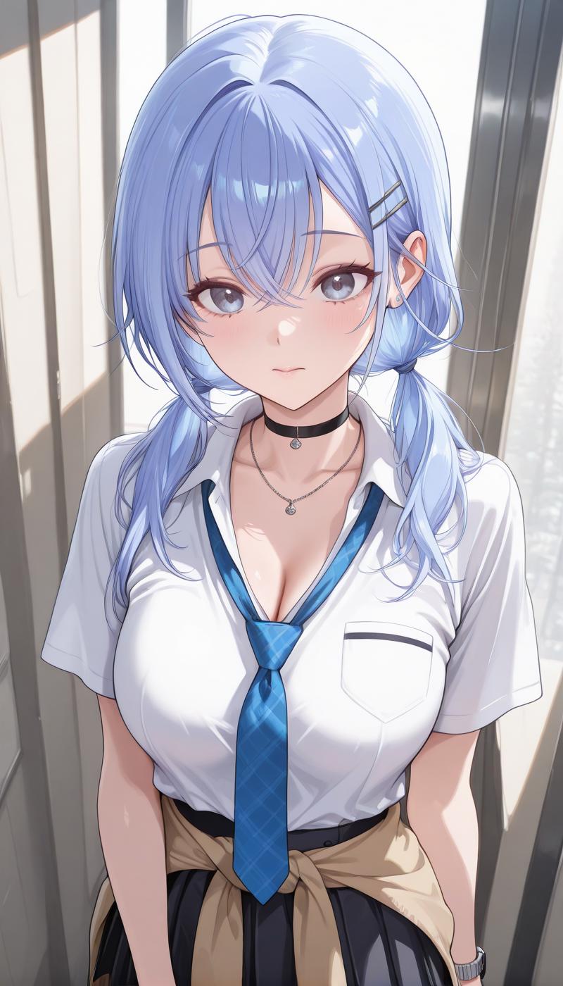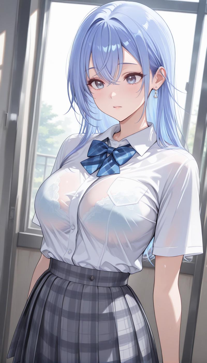 셔츠, 스커트, 리본, 보석, 학교 유니폼, 흰 셔츠, 단기 소매, 귀걸이, 주름 스커트, 칼라 셔츠, 넥타이, 체크무늬, 드레스 셔츠, 파란 리본, 체크 스커트, 회색 스커트, 파란 넥타이, 셔츠를 넣음, 옷을 통한 브라 노출, 곧은 머리,