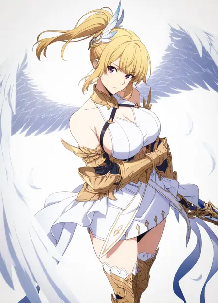 | 학습된 단어 | chapure, 1girl, blonde hair, weapon,gauntlets, hair ornament, bare shoulders, ponytail, holding weapon, white dress, dress, sword, holding, armor, bangs,purple eyes, feathers, feather hair ornament, thighs, long hair, large breasts, holding sword, sleeveless, sideboob, sidelocks, thighhighs, boots, armored boots, white thighhighs, thighs, greaves, armored dress,복사됨! |