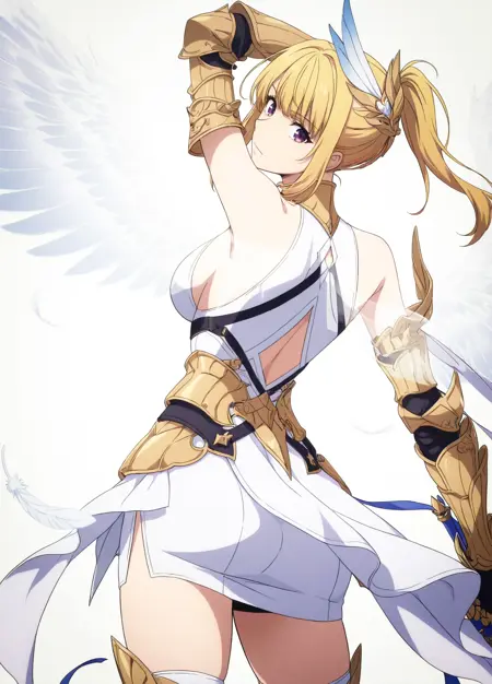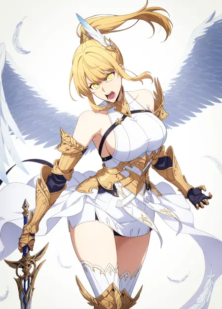 | 训练词汇 | chapure, 1girl, blonde hair, weapon,gauntlets, hair ornament, bare shoulders, ponytail, holding weapon, white dress, dress, sword, holding, armor, bangs,purple eyes, feathers, feather hair ornament, thighs, long hair, large breasts, holding sword, sleeveless, sideboob, sidelocks, thighhighs, boots, armored boots, white thighhighs, thighs, greaves, armored dress,已复制! |
