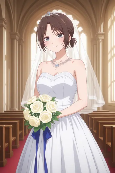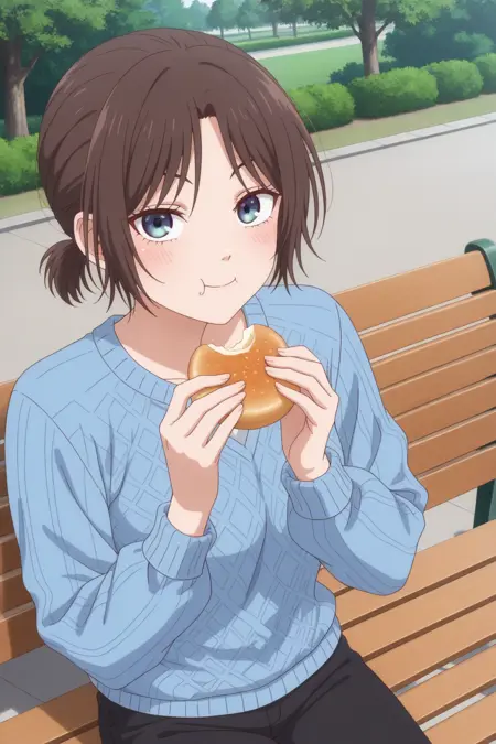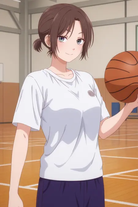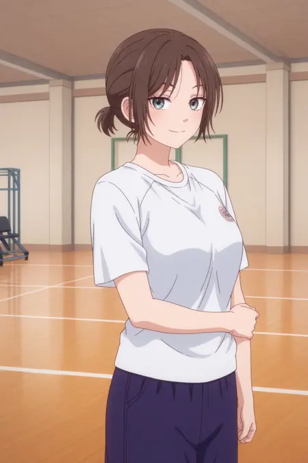 aaasahi, blue eyes, brown hair, short ponytail, asahigym, gym uniform, white t-shirt, gym shorts, blue shorts, anime coloring,