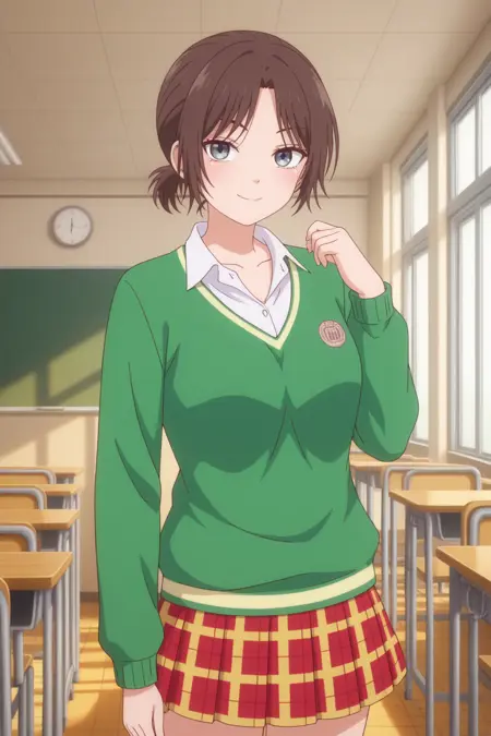 aaasahi, blue eyes, brown hair, short ponytail, asahischool, school uniform, white dress shirt, open collar, green sweater, red skirt, plaid skirt, pleated skirt, anime coloring,
