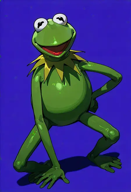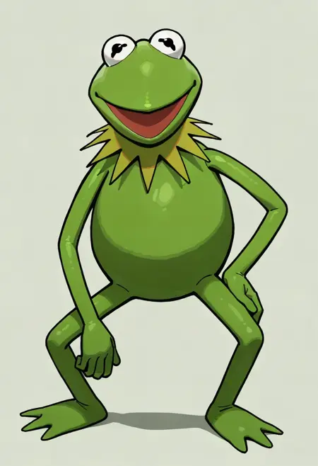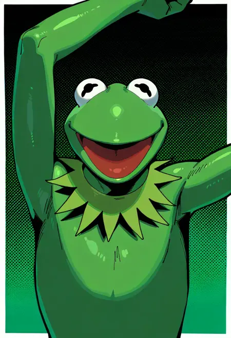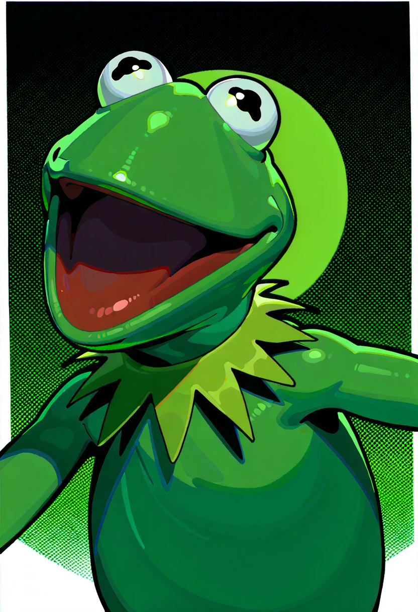 KermitTheFrogTM, 1boy, bright green body, spiky light green collar, large black eyes, round