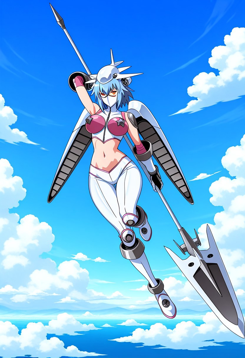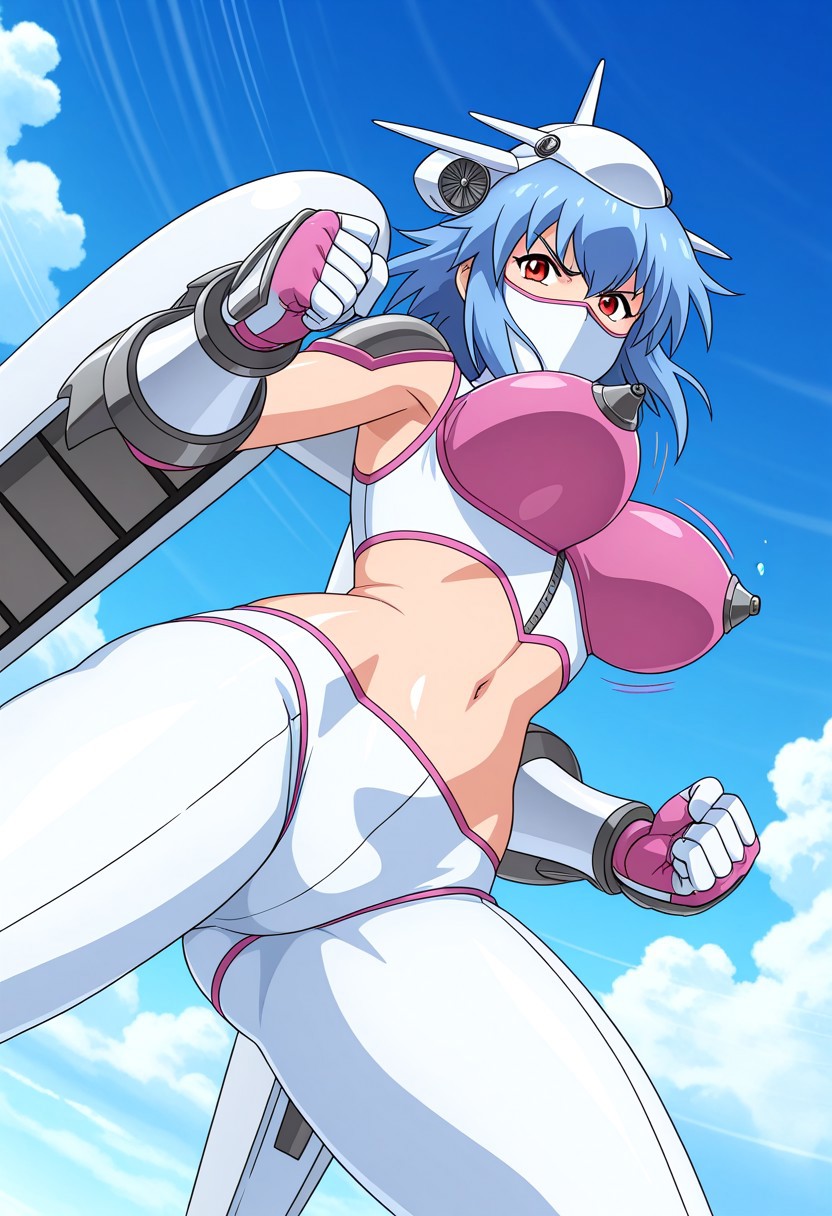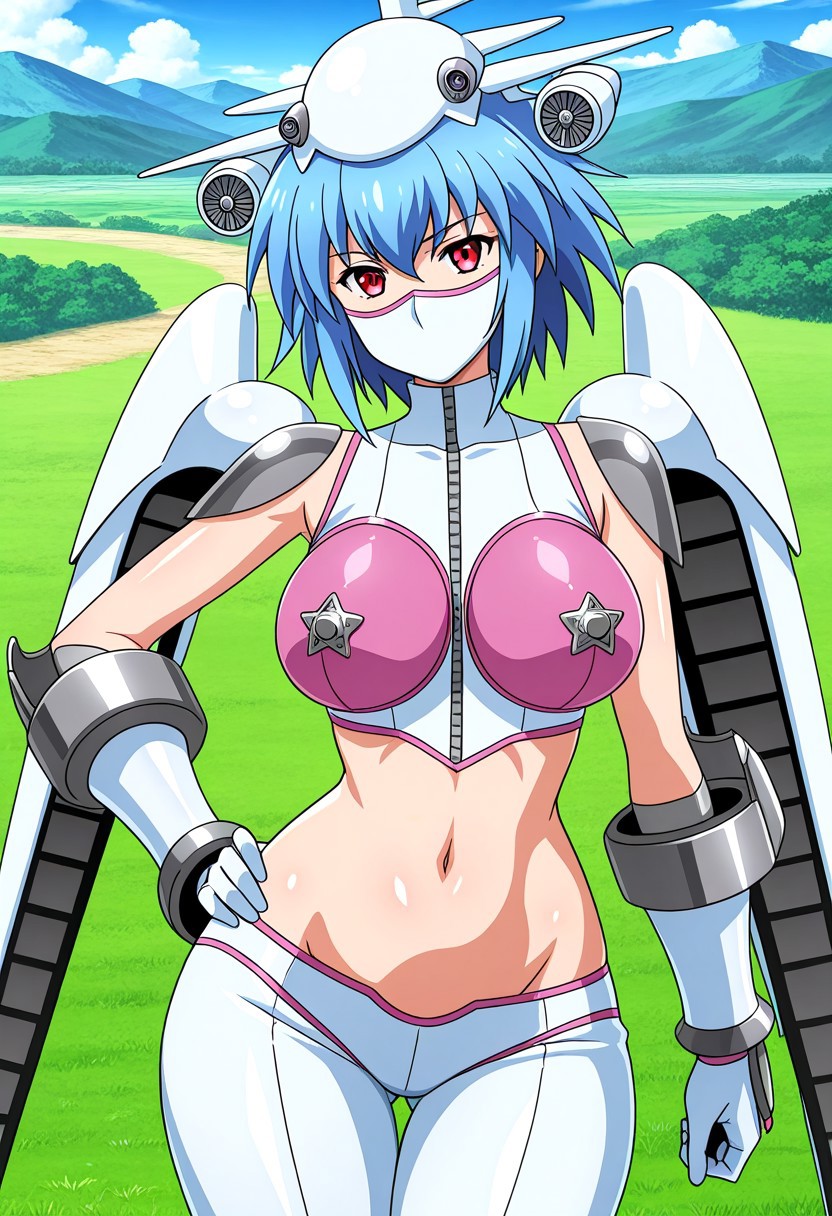 Jetsylphymonfrontier, 1girl, solo, red eyes, blue hair, short hair, hair between eyes, large breasts, curvy, wide hips, fair skin, shiny skin, smoothy skin, mature female, adult female, mature face, perfect body, bodysuit, armor, crop top, covered nipples, navel, midriff, gauntlets, weapon, mecha musume, boots, mecha wings, aircraft, headgear, mask, covered mouth, shiny armor, shiny clothes,