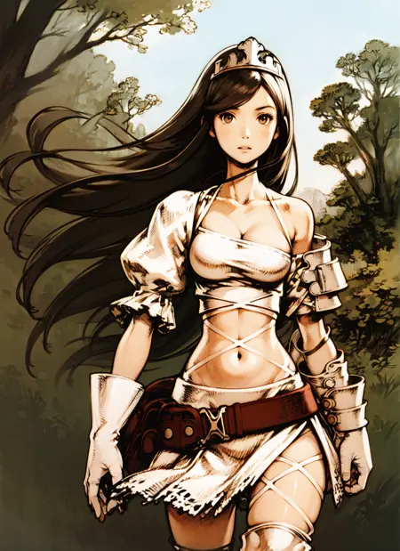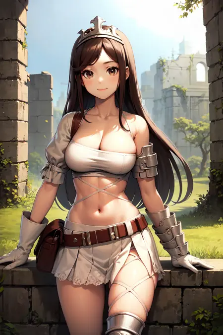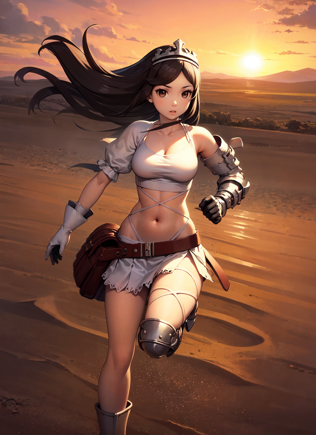 为她的服装添加:“发冠、盔甲、不对称服装、短上衣、手套、腰带、腰带包、裙子、护胫、护臂、靴子”。