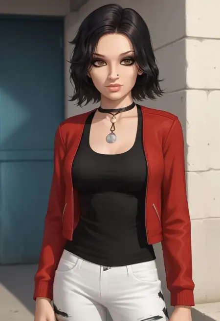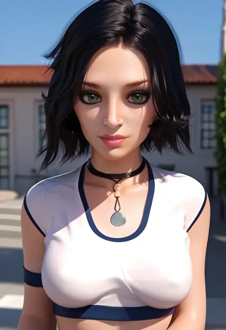 Jade,黑发,穿孔,鼻环,项圈,短发,吊坠,项链,中等胸部,眼影,棕色眼睛,