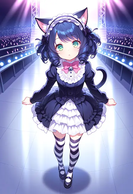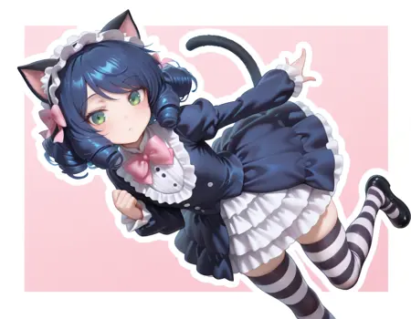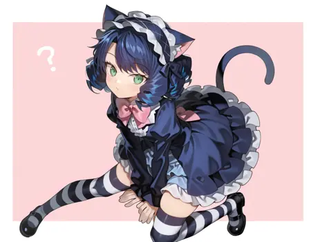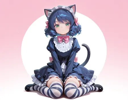 sbrcyn, 1girl, cat girl, cat tail, striped thighhighs, cat ears, goth fashion, mary janes, frilled dress, frilled hairband, short hair, curly hair, green eyes, pink bow, bowtie, blue dress, blue hair,