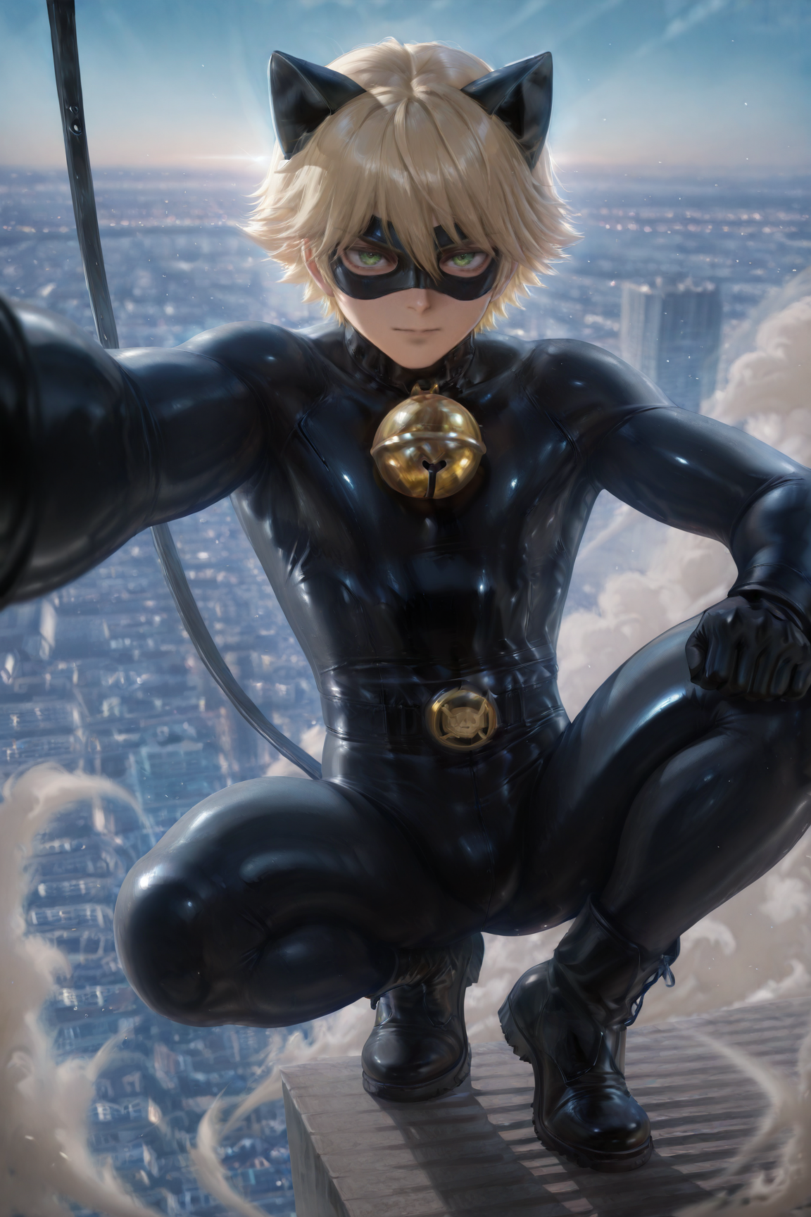 cat noir, blonde hair, green eyes, domino mask, black bodysuit, black gloves, cat ears, black gloves, black boots