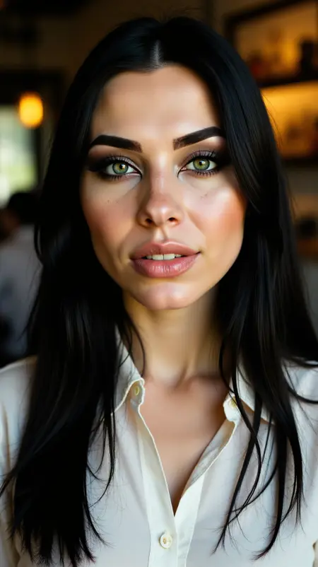 Pose & framing:shoulder up portrait, mid-body waist up, full body shot, dynamic pose, relaxed candid, looking away, direct gaze at camera