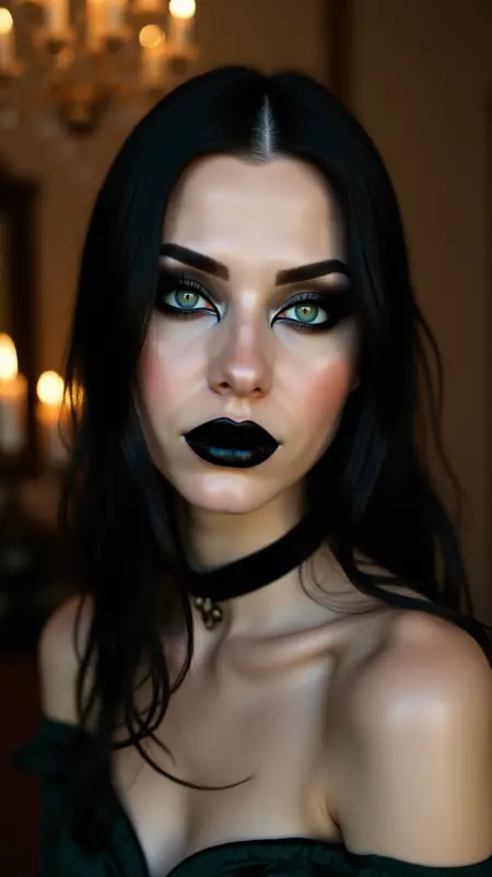 Physical traits:pale skin, fair complexion, light freckles (optional), vivid green almond-shaped eyes, long silky black hair, full lips with black lipstick