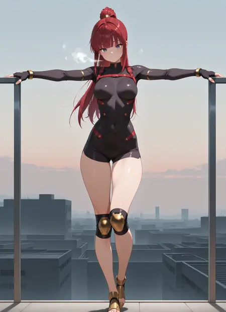 ビジュアルアイデンティティタグ:長い髪、ワインレッドの髪、高いポニーテール、濃い前髪、サイドの髪の毛、ストレートヘア、ゴールドのポニーテールホルダーパープルの目、スリムな体格、エレガントなスタイル、レッドとゴールドのテーマ