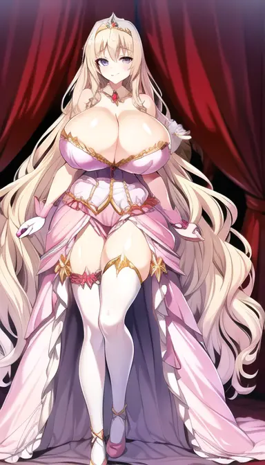 1)Russelior von Diamante, Blond, Long hair, Wavy hair, Grey eyes, (Huge Breasts:1.2), Pale skin, Young, Ankle-Strap Shoes, Bridal Gauntlet, Choker, Detached Sleeves, Gloves, Necklace, Strapless Dress, pink dress, ruffled dress, cleavage, Thigh-high Stockings, Tiara, High Heeled Shoes, Princess, detailed face and eyes, good anatomy, masterpiece, highest quality, intricate details,
