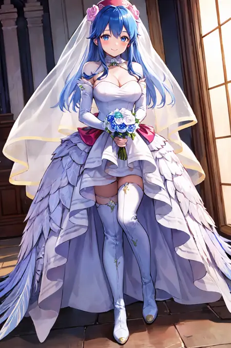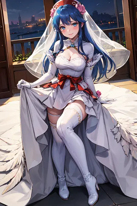【Wedding outfit】:wed_lilina, wedding dress, bridal veil, feather trim, thigh boots, white footwear, thighhighs, cleavage, elbow gloves, white gloves, hair ornament, high heels, hair flower