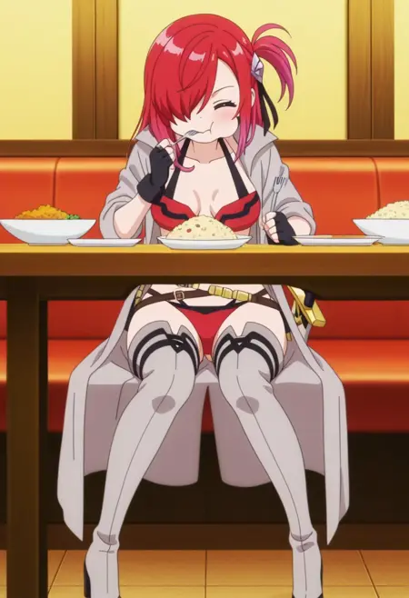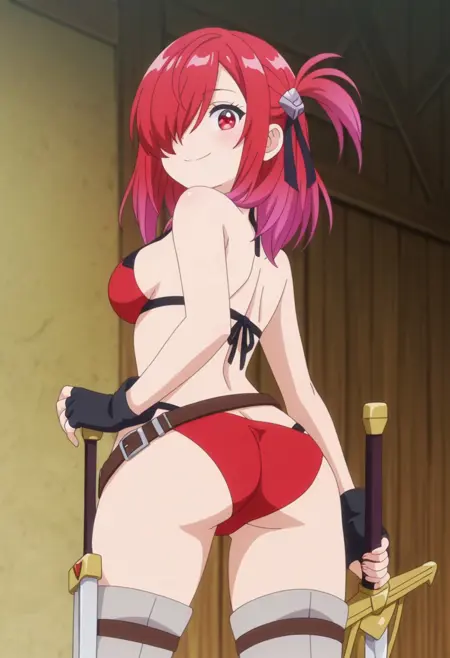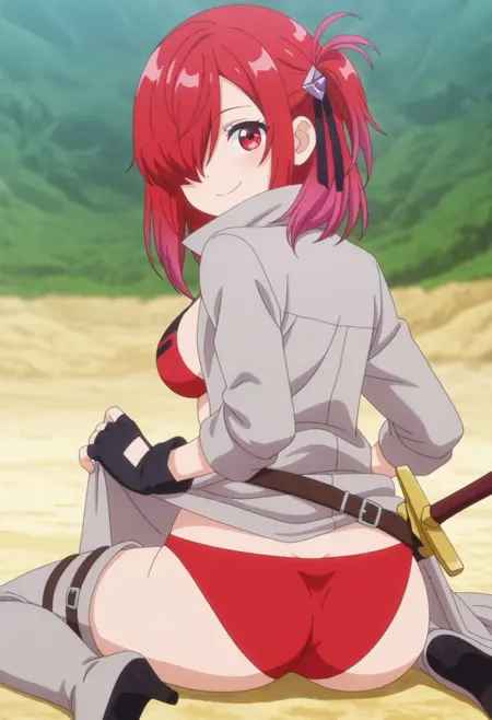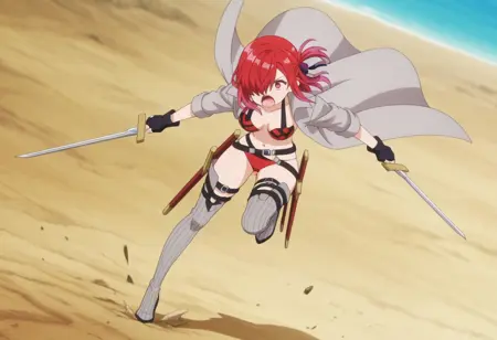 기본 복장: 비키니, 배꼽, 헤어 리본, 헤어 액세서리, 검은 장갑, 벨트, 검, 손가락 없는 장갑, 하이힐, 허벅지 사이로 엉덩이 보임, 소매 말아올린 상태, 벌어진 코트, 긴 코트, 회색 코트, 회색 허벅지 부츠, 빨간 비키니