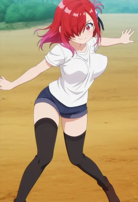 외모 (필요 없을 수도 있음): 빨간 눈, 보라색 머리, 빨간 머리, 중간 길이 머리, 중간 크기 가슴