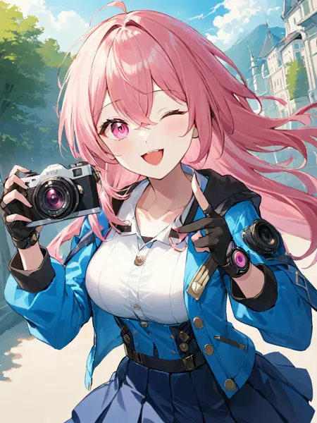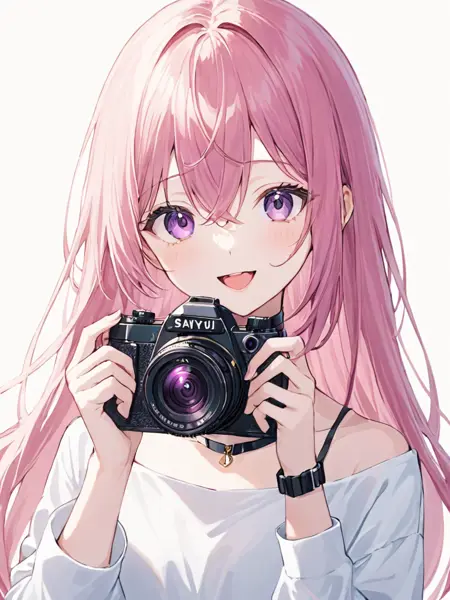 필수 긍정 태그: sanyueqi,1girl,solo,pink hair,long sleeves,blue eyes,bangs,shirt,white shirt,hair between eyes,pink eyes