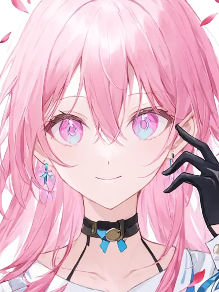 필수 긍정 태그: sanyueqi,1girl,solo,pink hair,long sleeves,blue eyes,bangs,shirt,white shirt,hair between eyes,pink eyes