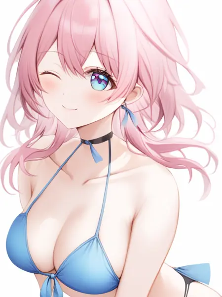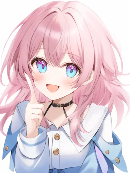 正面必备tag:sanyueqi,1girl,solo,pink hair,long sleeves,blue eyes,bangs,shirt,white shirt,hair between eyes,pink eyes
