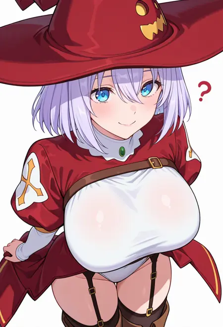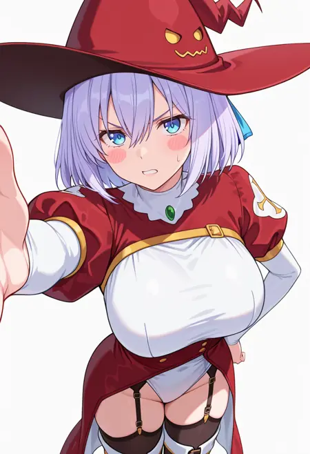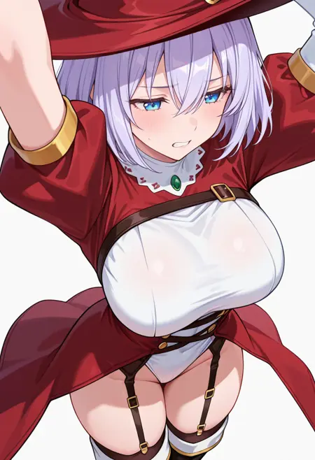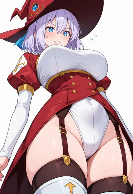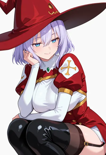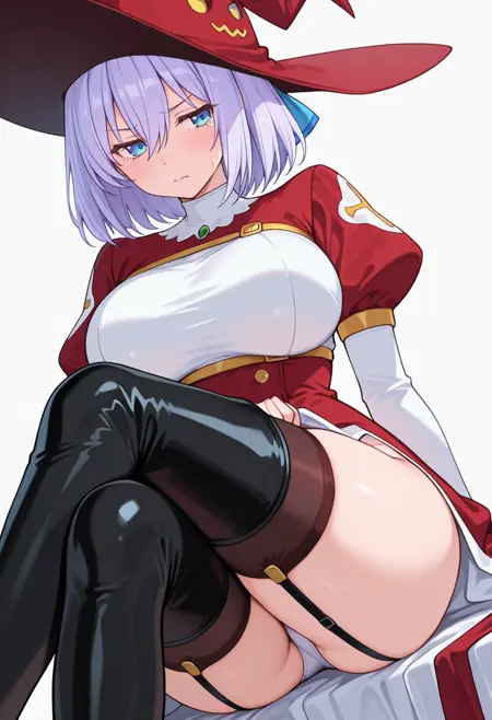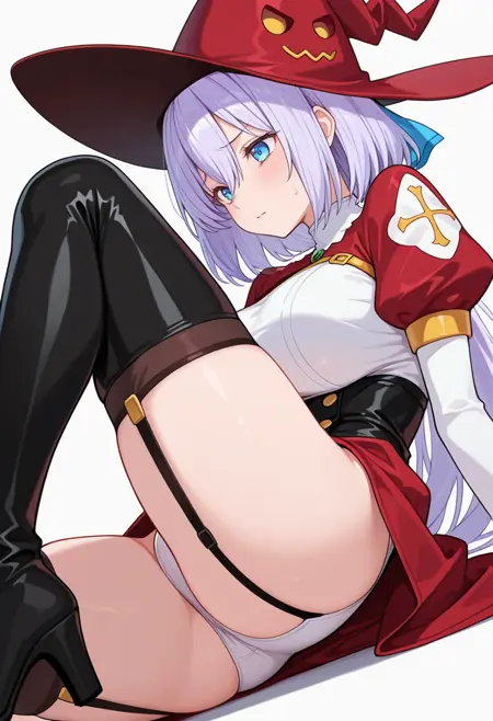witch hat,red dress, white dress, two-tone dress,white leotard, puffy sleeves,garter straps,black thighhighs,thigh boots,