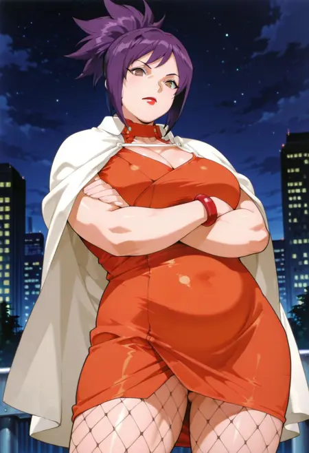 AnkoMitarashiMS, 1girl, solo, チビ, 肥満女性, 短髪, 紫髪, スパイキー髪, 前髪, ポニーテール, 茶色の目, 瞳のない目, 赤いリップ, 大きな胸, 大きなお腹, 大きなお尻, 太ももが太い, 白いマント, オレンジ色のドレス, 胸元, フィッシュネットタイツ, 赤いブレスレット, ブーツ,