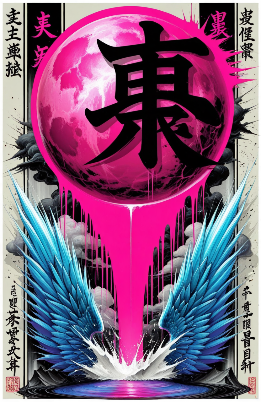 graphic violence style, ink explosion, kanji backdrop, violent motion, poster ink art, neo-japanese