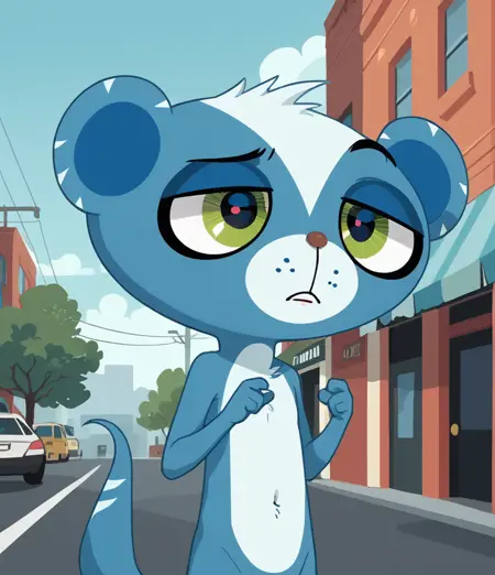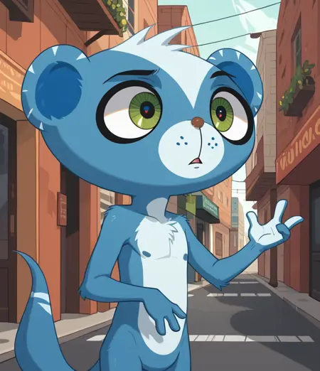lpsshahrukh, mongoose, light blue fur, green eyes, round ears, small nose, long tail, light blue tail, four fingers on arms, furry body, male body, two-tone fur