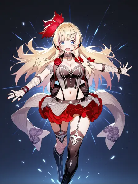 提示示例:utahosi, blonde hair, long hair, blue eyes, hair ornament, headset, cleavage, open jacket, armband, wristband, navel, red frilled skirt, garter straps, thighhighs, frilled boots, ribbon, striped shirt, full body, fishnet gauntlets,