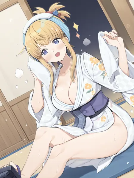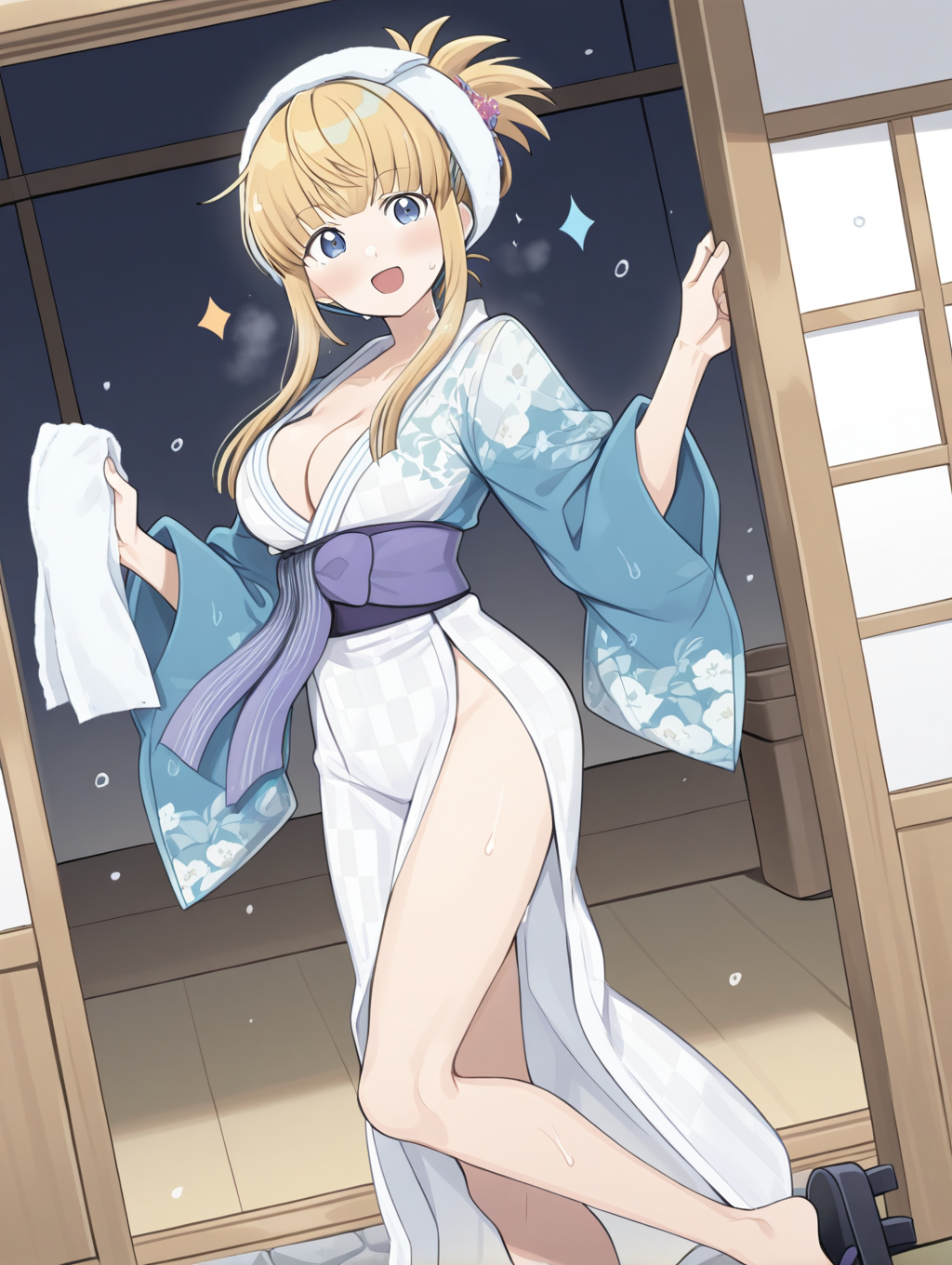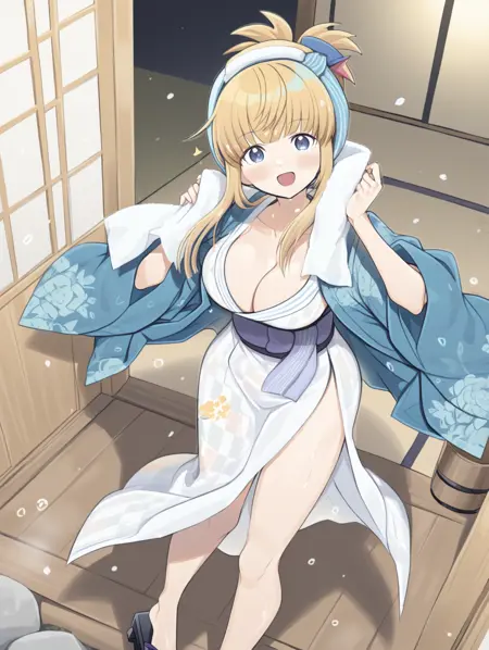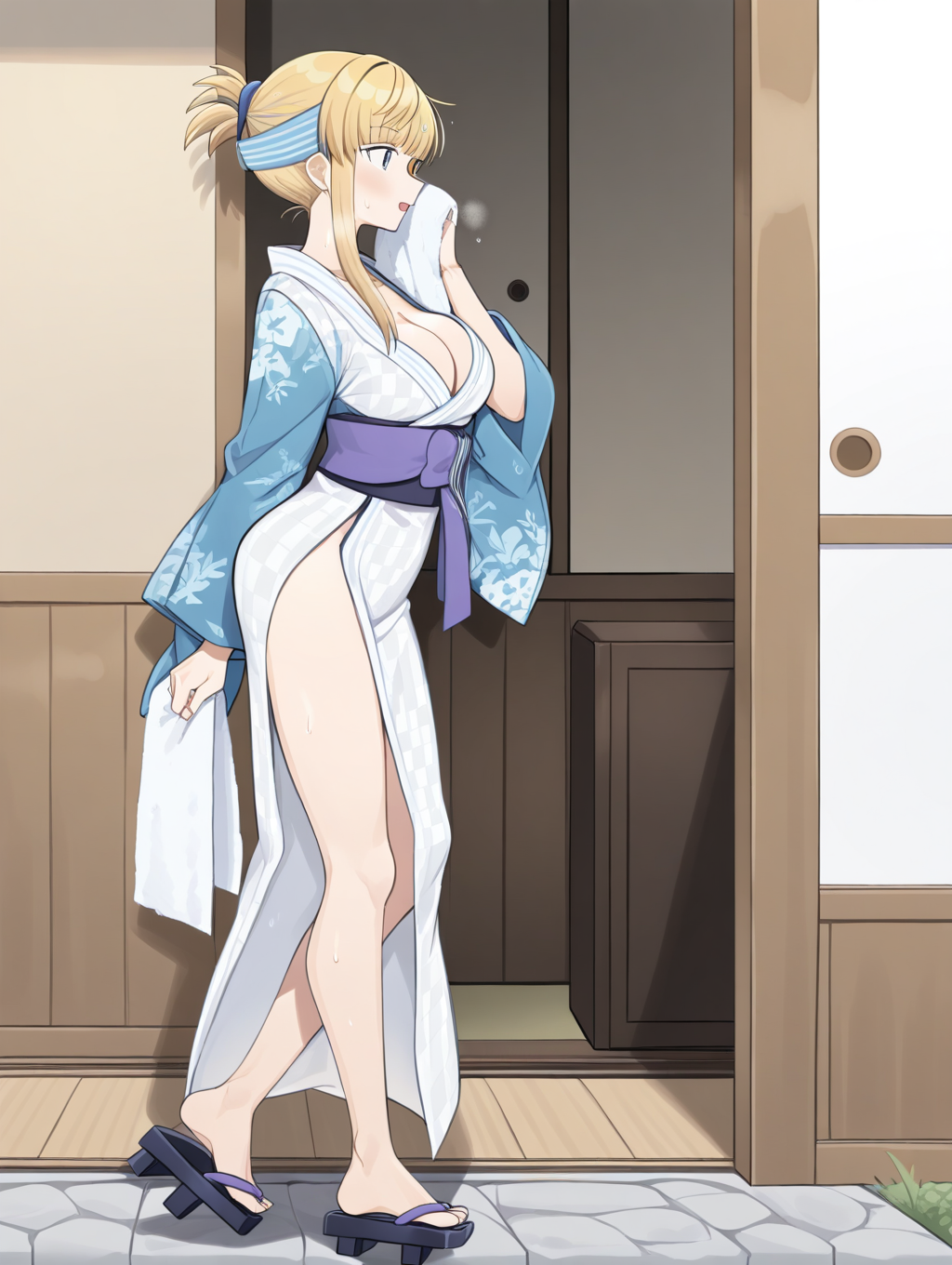 プロンプト例: senngou,blonde hair,updo,blue eyes,towel,kimono,wide sleeves,cleavage,sash,side slit,geta,