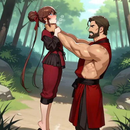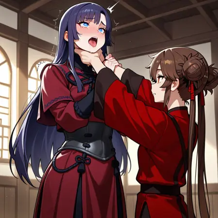 st_Throatlift, 1boy, hand on another's neck, lifting person, neck lift, male lifting female, 1girl, strangling, struggling, struggling, asphyxiation, trembling