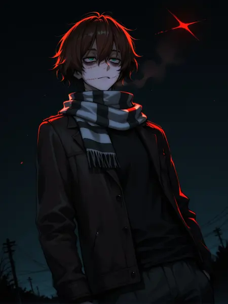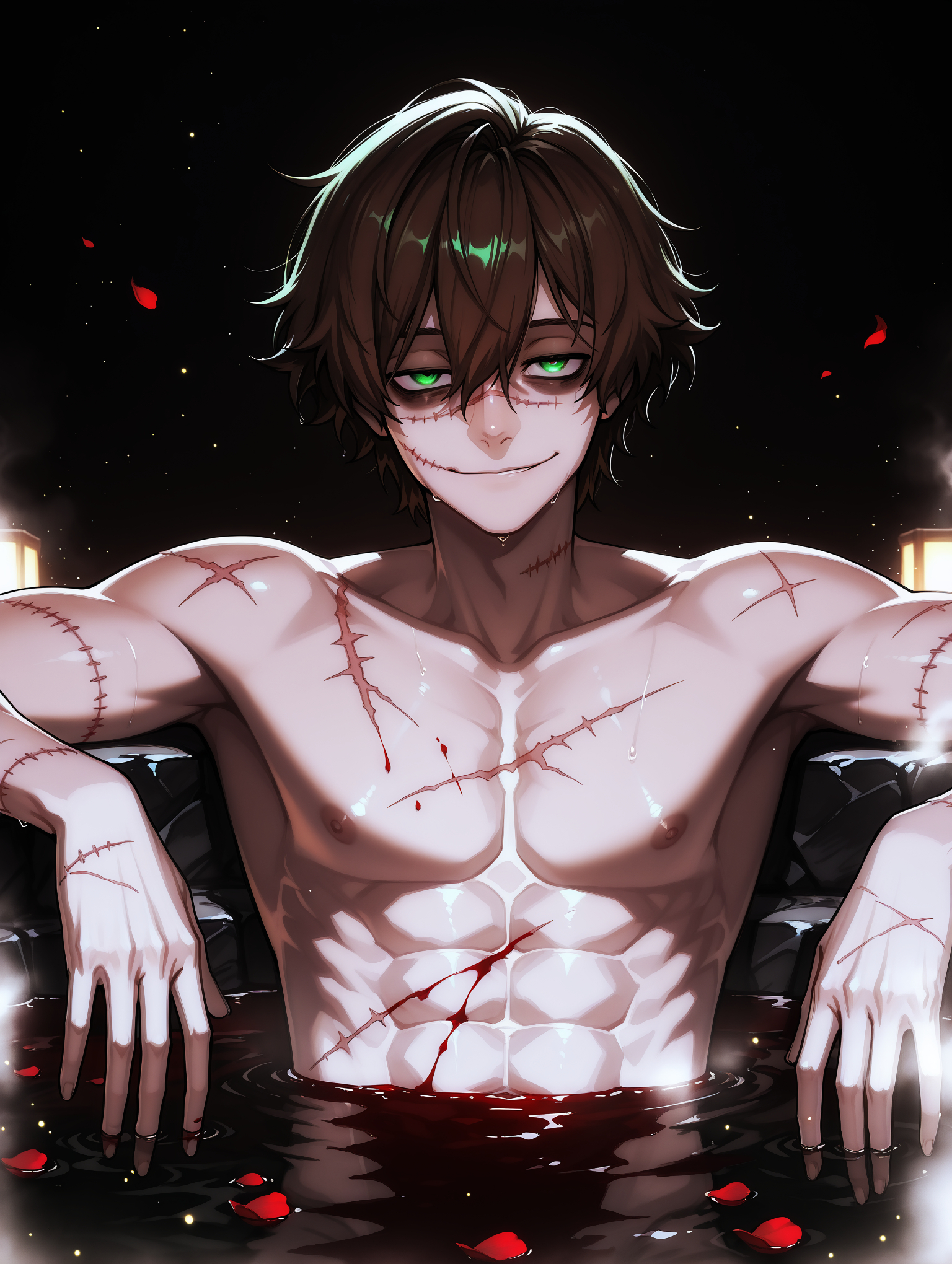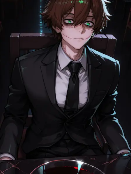 Liuのプロンプト:1boy, male, scar, stitches, scar on face, scars on face, brown hair, green eyes, hair between eyes, bags under eyes