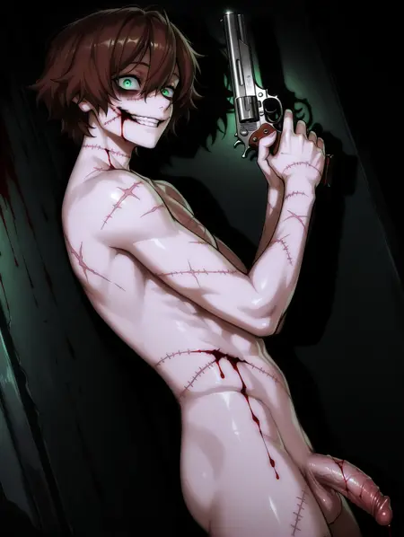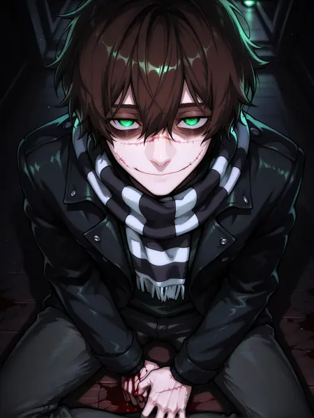 オプションのプロンプト:fit body, horror (theme), green jacket, open jacket, closed jacket, blood on face