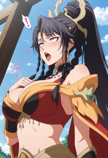zimo, 黑发, 长发, 高马尾, 双辫, 发饰, 紫色眼睛, 红唇,