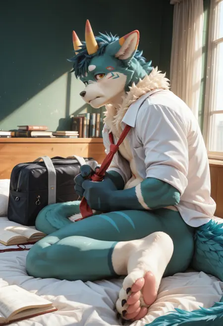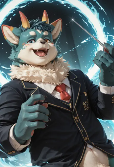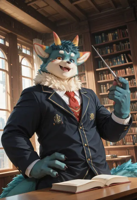 kant0s_xxl_w0ofia, chimera, furry, furry male, male focus, animal ears, bara, 1boy, adult, tail, solo, horns, heterochromia, body fur, looking at viewer, white fluffy neck fur, school uniform, jacket, red necktie, bottomless